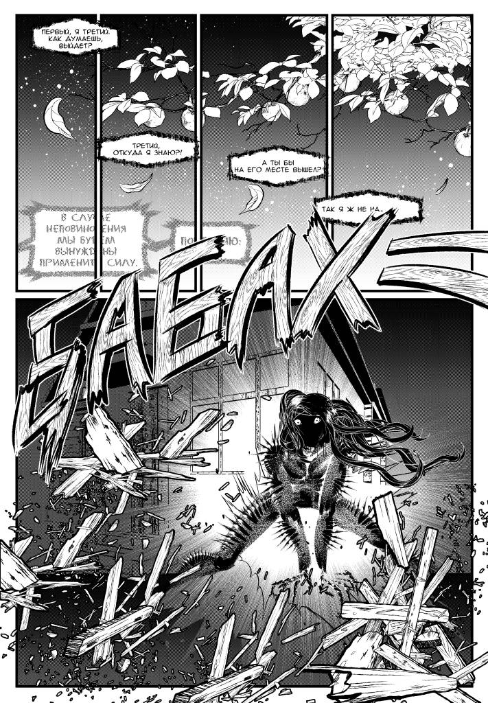 Единственный парень в компании, Вано, произнёс коронное "я, конечно извиняюсь за мой русский, но.... Бабы, вы что, совсем орхенели? Не в корпусе же!" Когда возвращаются в типографию, там раскардаш: всюду порошок из ксерокса, чёрным-черно, разбит казённый монитор... А скелет сидит под столом. Сидящий под столом павук не предпринимает активности. Спойлер: может двигаться только в темноте. У него статы такие, что мог бы немало дел наворотить, если бы рыпался. Он большой, вместо лап – барцовые кости. Да, ночью он начнёт за игроками гоняться...скорее всего.